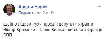"Только что лидеры Руха, народные депутаты Украины Виктор Кривенко и Павел Кишкарь вышли из фракции БПП", - говорится в сообщении.