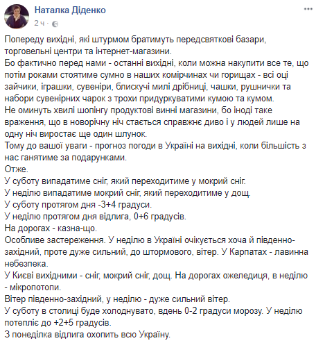 На выходных в Украину придет оттепель, которая будет сопровождаться сильным ветром. Об этом в Facebook сообщает синоптик Наталья Диденко.