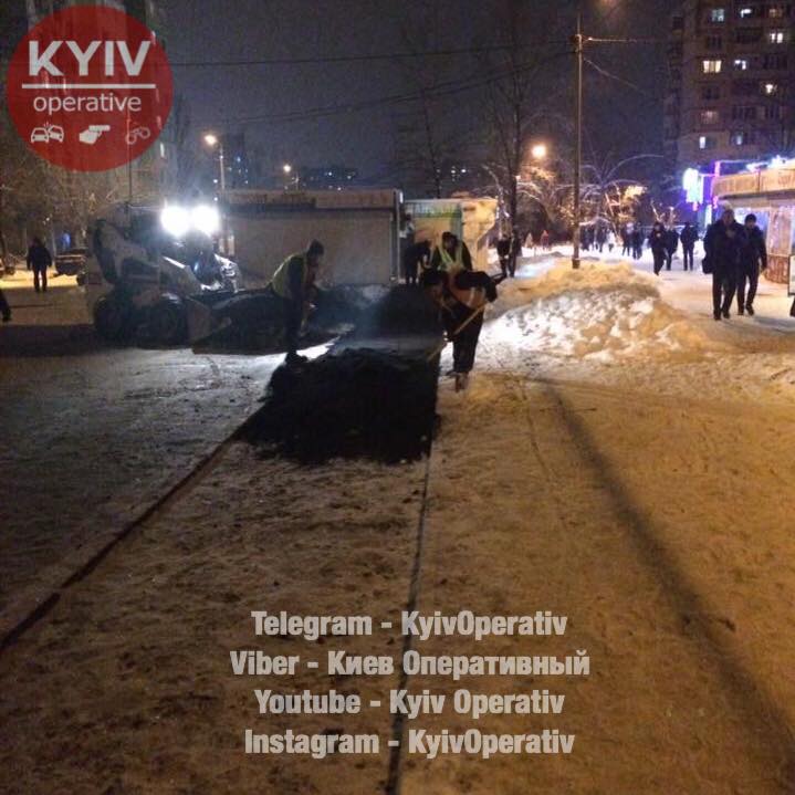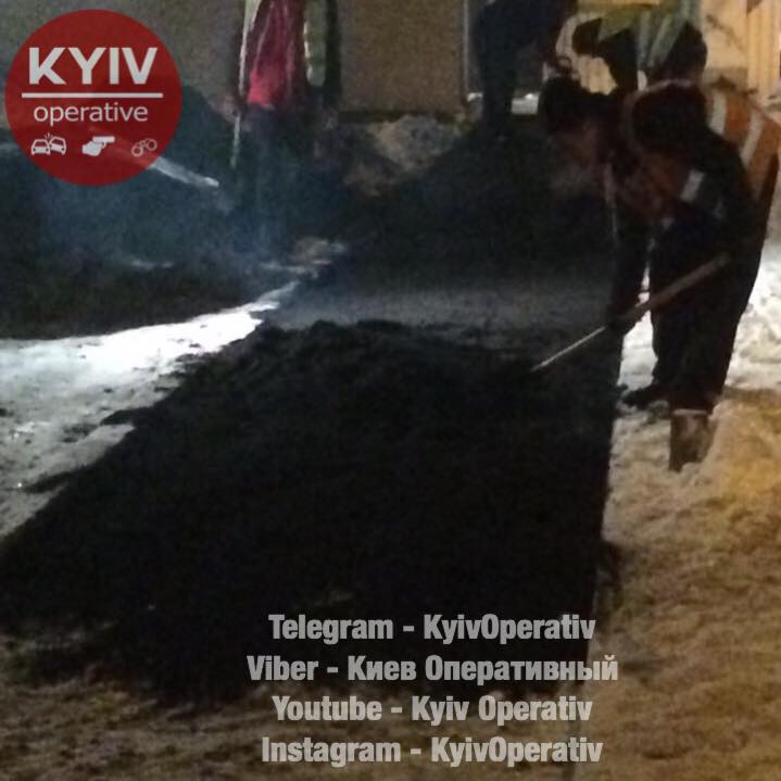 Возле станции метро "Героев Днепра" рабочих, которые укладывали асфальт в таких неподходящих погодных условиях, заметили прохожие и сфотографировали.