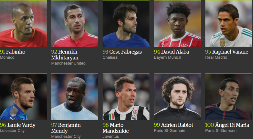 Лионель Месси победил в рейтинге The Guardian в четвертый раз (2012, 2013, 2015, 2017), в то время как Криштиану Роналду признавался лучшим дважды (2014 и 2016 год).