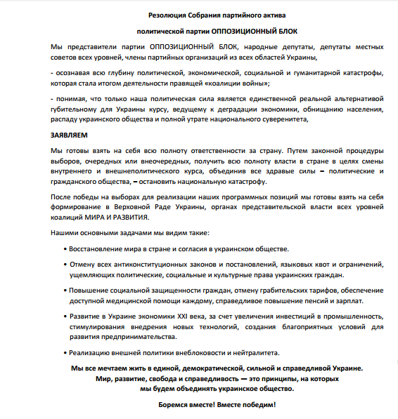 После победы на выборах Оппозиционный блок обещает сформировать в Верховной Раде Украины коалиции мира и развития. Ее основными задачами будет восстановление мира в стране, отмена всех антиконституционных законов и постановлений, языковых квот и ограничений.