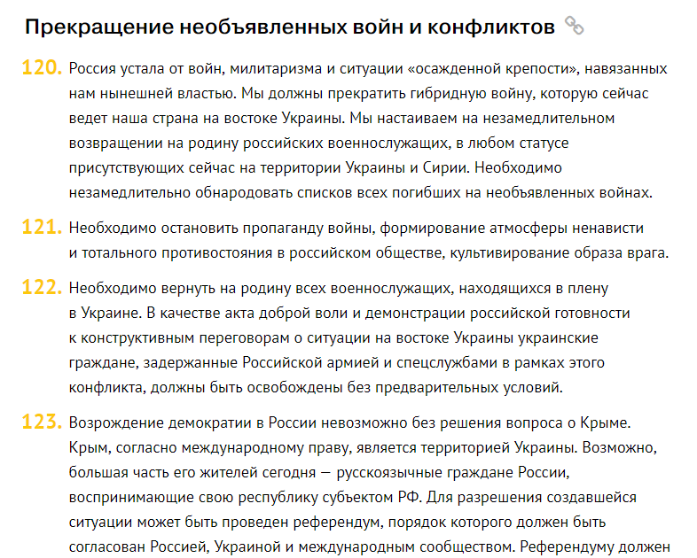 В разделе "Внутренняя политика" идет речь о том, что РФ должна перейти от "суперпрезидентской республики" к "полноформатной парламентской демократии".