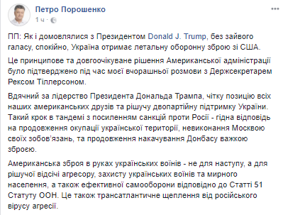 Президент Украины Петр Порошенко заявил, что Украина в скором времени получит летальное оборонительное оружие из США. Об этом он написал на своей странице в Facebook.