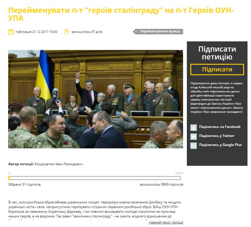 "Во время, когда российское оружие убивает украинских солдат, терроризирует мирное население Донбасса и уничтожает украинские города и села, недопустимо героизировать исторические победы русского оружия. Бойцы ОУН-УПА - боролись за независимое Украинское государство, и мы должны воспитывать молодое поколение на примере наших героев , а не враждебных. Так называемые "защитники Сталинграда" - не имеют никакого отношения к борьбе украинского народа за нашу независимость, и поэтому данная название должно быть изменена, поскольку не несет никакой исторической ценности для памяти украинского народа ", - пишет автор петиции Иван Кондратюк.