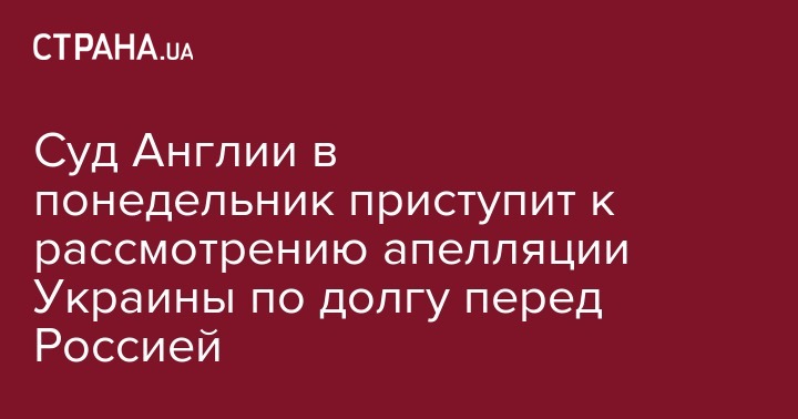 Апелляционный суд Англии приступит в понедельник в рассмотрению апелляционной жалобы Украины на решение Высокого суда Лондона по долгу перед Россией в размере $3 млрд. Об этом сообщает ТАСС со ссылкой на пресс-службу суда.