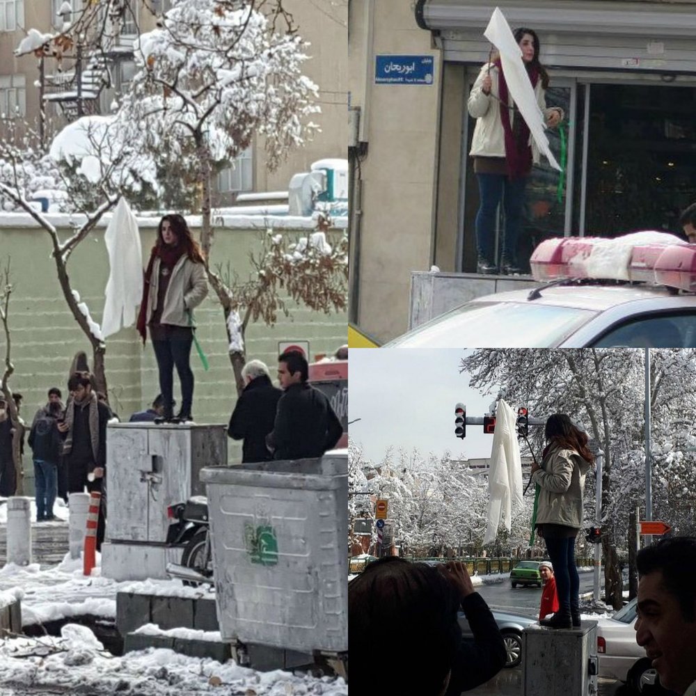 27 декабря женщина взобралась с распущенными волосами на будку на проспекте Энгелаб в Тегеране, размахивая платком словно флагом. Ее фотографии и видео широко разошлись в социальных сетях.