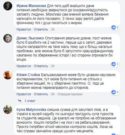 Или Николай Пирогов захотел бы, чтобы деньги, которые можно использовать для лечения живых людей, тратились на процедуру ребальзамирования, которая уже не поможет никому? Или в Украине в XXI веке бюджетные средства должны тратиться на подобные процедуры?", - спрашивает Супрун.