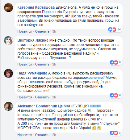 "Дешевый популизм, приправленный эмоциями. Мало воруют и берут взятки в курируемых МОЗ предприятиях? Мало выделяют на лечение бидось-депутатов? 32 млрд бюджет МОЗ, точно, все проблемы решат 200 тысяч на мумию Пирогова", - отмечает Мария Лисничук.