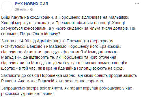 "Завтра в 14:00 под Администрацией Президента (перекресток Институтской-Банковой) напомним Порошенко его "райский" отдых. Активисты проведут флеш-моб "Чемодан-вокзал-Мальдивы", где воссоздадут то, как Порошенко и его окружение отдыхали на Мальдивах: девушки в купальных костюмах, ребята в шортах - в то время, как в стране идет война и ребята воюют на востоке. Призвать к совести Порошенко бесполезно, он свою совесть продал вместо Рошена. Но может Банковой хоть немного станет стыдно", - говорится в сообщении.