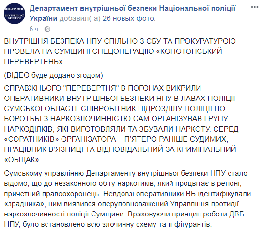 В Сумской области задержан оперуполномоченый местного полицейского управления противодействия наркопреступности, который по версии следствия сам организовал банду наркоторговцев.