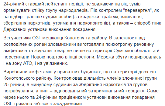 Под контролем "оборотня", как на подбор - ранее судимые лица (за кражи, грабежи, употребление, хранение наркотиков, содержание наркопритонов), а также - сотрудник Государственного учреждения исполнения наказания. Все участники ОПГ - жители Конотопа и района. В зависимости от распределенных ролей злоумышленники изготавливали психотропное вещество амфетамин и сбывали товар не только на территории Сумской области, но и пересылали «Новой почтой» в другие регионы. Сеть сбыта распространялась и на зону АТО, и на заключенных", - говорится в опубликованном сообщении.