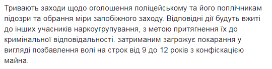 Также устанавливаются другие лица, причастные к незаконному обороту наркотических средств. Задержанным грозит до 12 лет лишения свободы с конфискацией имущества. По информации ДВБ Национальной полиции Украины, обнародованной в Facebook, к созданию схемы незаконного оборота наркотиков причастен 24-летний старший лейтенант полиции. "24-летний старший лейтенант полиции, несмотря на возраст, сумел организовать стойкую группу наркодилеров.
