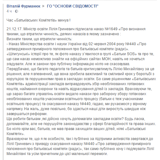 "Предвижу, что многие педагоги и родители будут критиковать Лилию Михайловну за это решение, но она сделала важный и смелый шаг в борьбе с коррупцией и нарушениями прав в учреждениях образования. Ибо именно решениями "Родительских Комитетов" администрации заведений оправдывают сбор неучтенных наличных средств, наем охраны и даже отчисление детей из учреждений", – написал Виталий Фурманюк.