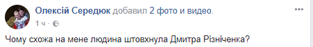 На своей странице в Facebook Середюк пояснил, что "человек похожий на него" толкнул Резниченко из-за его комментария по поводу ареста одного из поджигателей Десятинного монастыря Алексея Шемотюка. Середюк выложил скрин поста Резниченко.