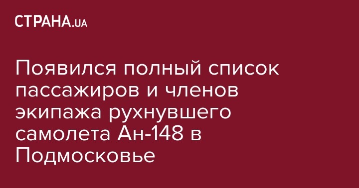 На сайте МЧС России опубликован полный список пассажиров и членов экипажа Ан-148 "Саратовских авиалиний", который разбился сегодня в Раменском районе Подмосковья.