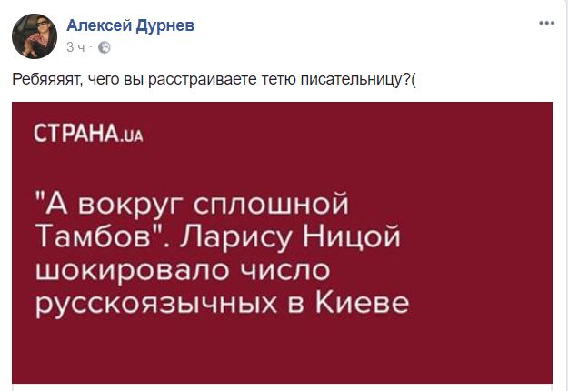 "Сын пригласил в кино. Побежал за попкорном. Стою. Одна. Посреди великого русского моря. Одна. Песчинка. А вокруг сплошной тамбов", – пишет Ницой, имея ввиду русскоязычных украинцев.