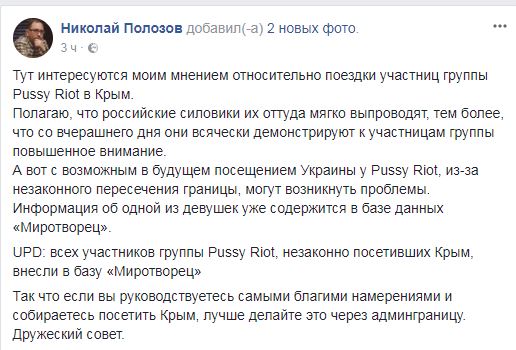 По его словам, с возможным в будущем посещением Украины у Pussy Riot, из-за незаконного пересечения границы, возникнут проблемы, поскольку всех участников группы Pussy Riot, незаконно посетивших Крым, внесли в базу "Миротворец".