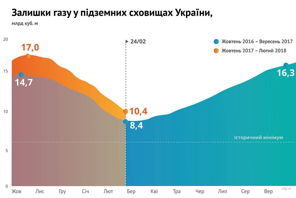 Так по состоянию на 26 февраля этого года в хранилищах остается 10,4 миллиарда кубометров газа. Данное количество превышает показатели за аналогичный период прошлого года.