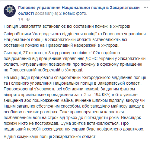 Сейчас по факту возгорания возбуждено уголовное дело по ч.2 ст.194 УК Украины - умышленное уничтожение или повреждение имущества путем поджога. Виновникам грозит от 3 до 15 лет заключения.