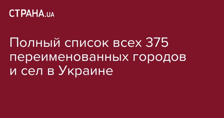Всего переименованы 375 населенных пунктов и районов. Больше всего переименований будет в Днепропетровской области - здесь сменят 42 названия. В Одесской области декоммунизируют 31 название, в Полтавской и Харьковской - по 24, в Черниговской - 20, в Запорожской - 19.