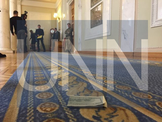 После окончания утреннего заседания парламента, когда депутаты выходили из сессионного зала, у одного из них выпали две купюры номиналом 100 долларов США.