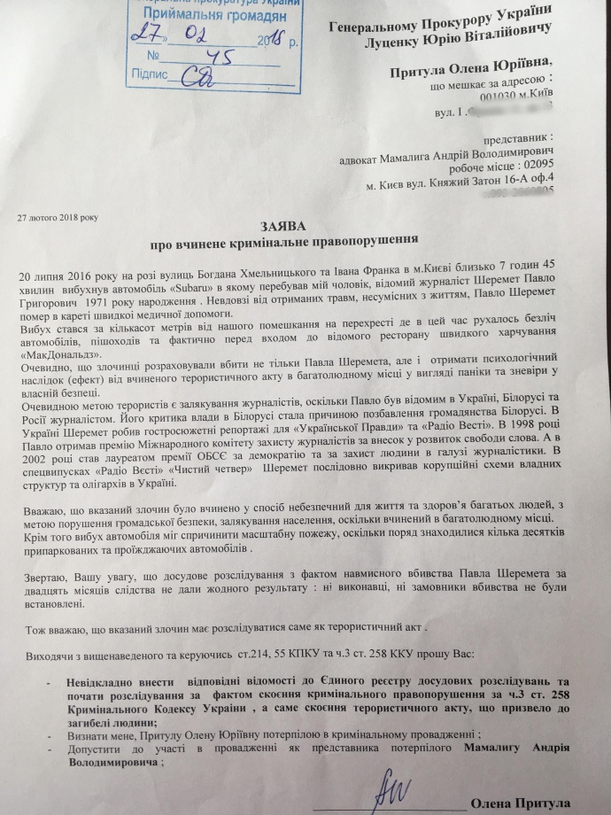 В заявлении о совершении уголовного преступления указывается, что преступники рассчитывали убить не только Шеремета, но и получить психологический эффект от совершенного террористического акта в многолюдном месте в виде паники и уныния в собственной безопасности.