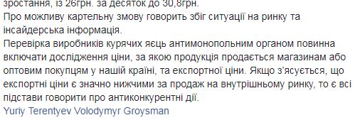 При этом Дорошенко заявляет, что с учетом перехода от расчетов цены за 1 и 2 категории к средней цене, можно говорить о 18% роста стоимости за десяток яиц. По этой причине эксперт считает, что должна быть проведена проверка производителей и исследование цены.