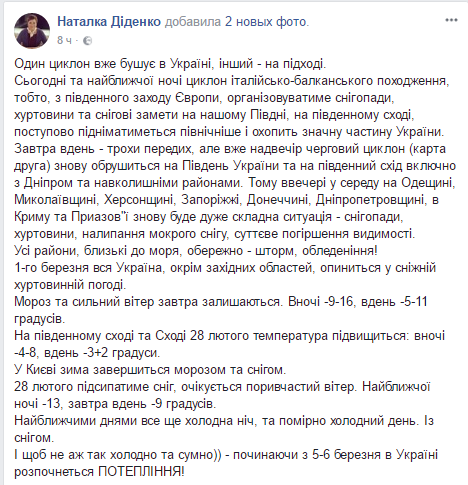 По данным Диденко, 1 марта на всей территории Украины, кроме западных областей, ожидается снежная вьюжная погода.