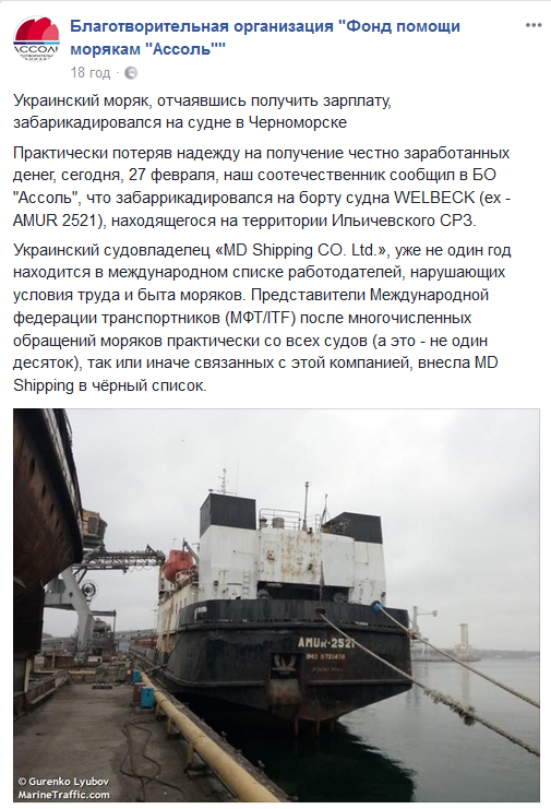 Украинский судовладелец "MD Shipping CO. Ltd", уже не один год находится в международном списке работодателей, нарушающих условия труда и быта моряков. Представители Международной федерации транспортников (МФТ/ITF) после многочисленных обращений моряков практически со всех судов (а это - не один десяток), так или иначе связанных с этой компанией, внесла MD Shipping в чёрный список", - сообщили в Фонде.