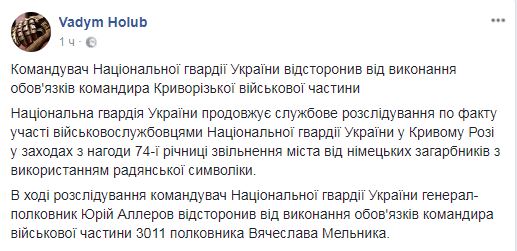 "Национальная гвардия Украины продолжает служебное расследование по факту участия военнослужащих Национальной гвардии Украины в Кривом Роге в мероприятиях по случаю 74-й годовщины освобождения города от немецких захватчиков с использованием советской символики. В ходе расследования командующий Национальной гвардии Украины генерал-полковник Юрий Аллеров отстранил от исполнения обязанностей командира воинской части 3011 полковника Вячеслава Мельника", – отметил Голуб.