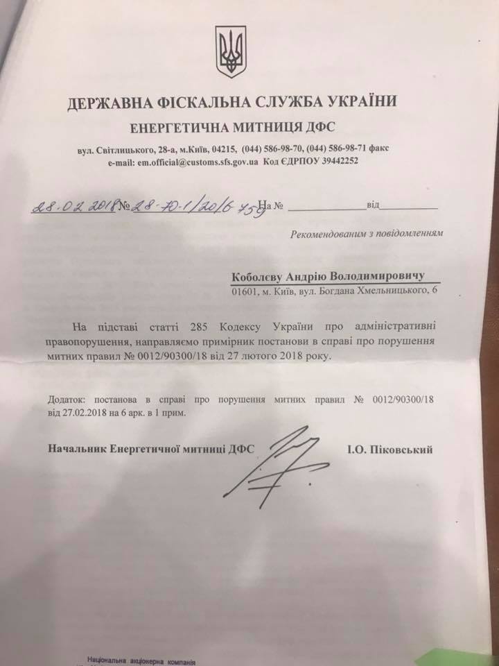 Глава правления "Нафтогаза" Андрей Коболев рассказал, что сегодня, 1 марта, получил от Государственной фискальной службы Украины два персональных штрафа на сумму 7 и 1,3 млрд грн.
