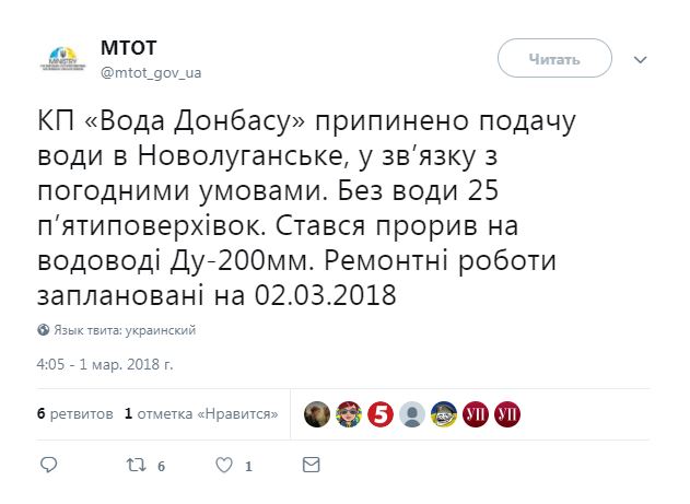 "Без воды 25 пятиэтажек. Произошел прорыв на водоводе Ду-200 мм. Ремонтные работы запланированы на 02.03.2018", - говорят в министерстве.