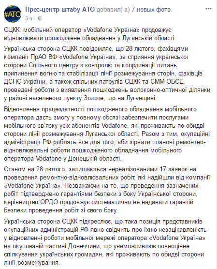 28 февраля специалисты компании "Vodafone Украина" занимались поисками повреждения систем мобильной связи в районе Золотого Луганской области, но еще не выполнено 17 заявок на ремонт в Донецкой области. Напомним, ранее в Минске представители "ДНР" гарантировали безопасность ремонтникам Vodafone
