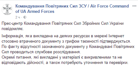 Указывается, что по факту отсутствия документа с грифом секретности в Командовании Воздушных Сил проводится служебное расследование", - говорится в сообщении.