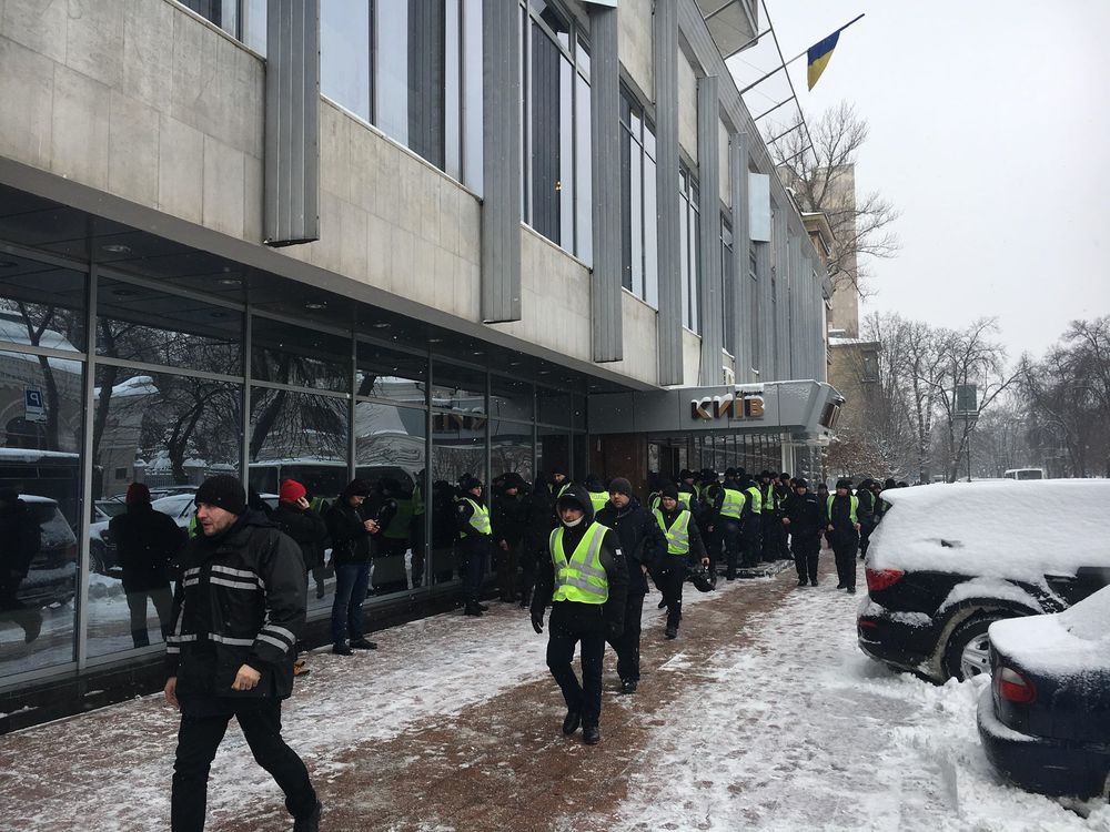 У входа в гостиницу Киев дежурят несколько десятков сотрудников полиции.