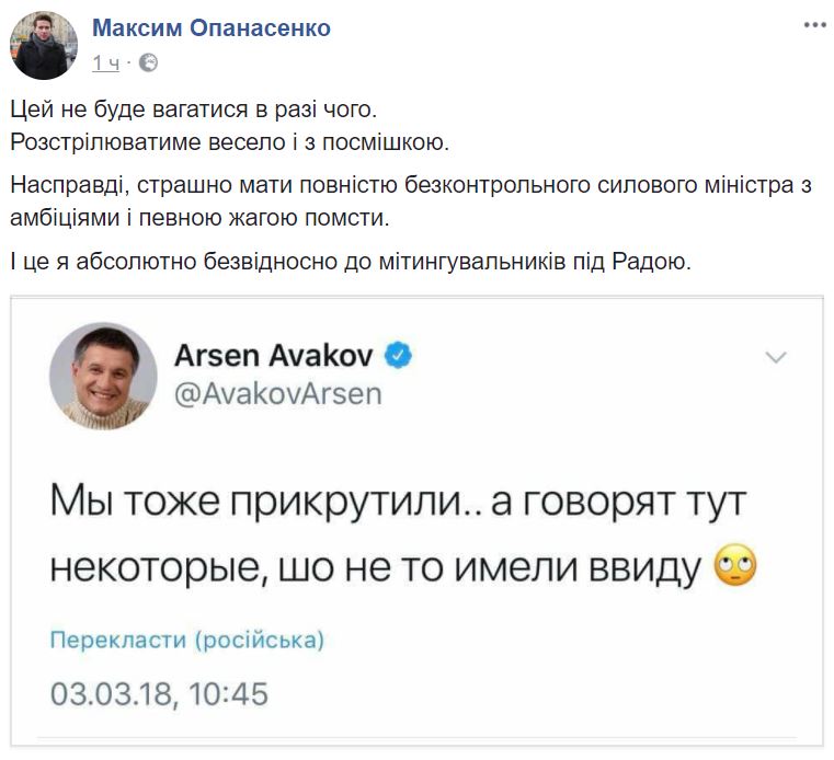 Журналист-расследователь Максим Опанасенко пишет, что страшно иметь полностью бесконтрольного силового министра с амбициями и определенной жаждой мести.