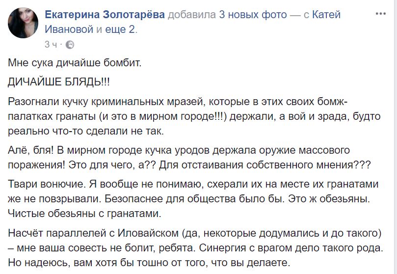 "Разогнали кучку криминальных мразей, которые в этих своих бомж-палатках гранаты (и это в мирном городе!!!) держали, а вой и зрада, будто реально что-то сделали не так", – пишет блогерша. Далее она предложила взорвать их теми же гранатами (скриншот не приводится из соображений морали. – Прим. Ред.)