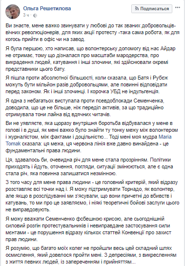 "Порошенко и Аваков решили идти по пути создания полицейского государства, а это значит, что права на мирный протест мы уже не имеем. Уничтожен лагерь активистов, которые под парламентом требовали создания независимого Антикоррупционного суда.