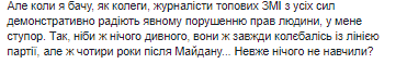 "Но когда я вижу, как коллеги, журналисты топовых СМИ изо всех сил демонстративно радуются явном нарушению прав человека, у меня ступор. Так, вроде бы ничего удивительного, они же всегда колебались с линией партии, но четыре года после Майдана ... Неужели ничему не научили?", - спрашивает она.