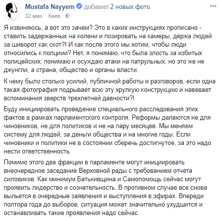 "Я извиняюсь, а вот это зачем? Это в каких инструкциях прописано – ставить задержанных на колени и позировать на камеры, держа людей за шиворот, как скот?! И как после этого мы хотим, чтобы люди относились к полиции? Нет, я понимаю, что была злость за избитых полицейских; понимаю и осуждаю атаки на патрульных, но это же не джунгли, а страна, общество и органы власти.