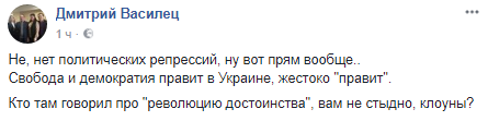 "Не, нет политических репрессий, ну вот прям вообще... Свобода и демократия правит в Украине, жестоко "правит". Кто там говорил про "революцию достоинства", вам не стыдно, клоуны?" – прокомментировал фото журналист Дмитрий Василец.