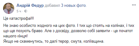 "Это катастрофа!!! Не знаю никого лично на этих фото. И тех, что стоят на коленях, и тех что позируют браво. Но по опыту, позволю себе заявить - это начало нашего конца! Если не опомниться, то дальше террор, смута, колиивщина", - написал он.