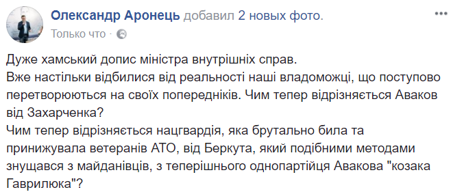 "Свободовец" Александр Аронец назвал пост Авакова хамским.