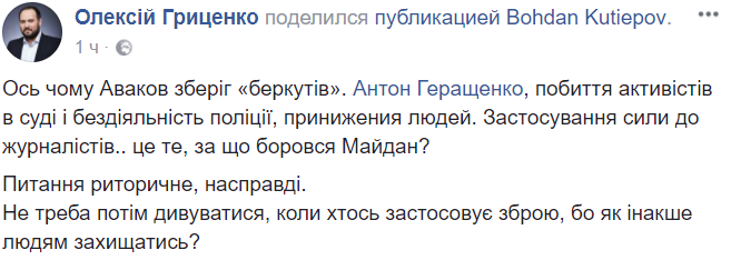 "Вот почему Аваков сохранил "беркутов". Избиения активистов в суде и бездействие полиции, унижения людей. Применение силы к журналистам... это то, за что боролся Майдан?
