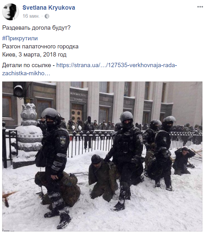 Позже представитель Нацполиции Руслан Форостяк объяснил, что активистов никто не унижал, а фото не так истолковали. Мол, если бы их положили лицом в снег, как это обычно делается, они бы просто замерзли.