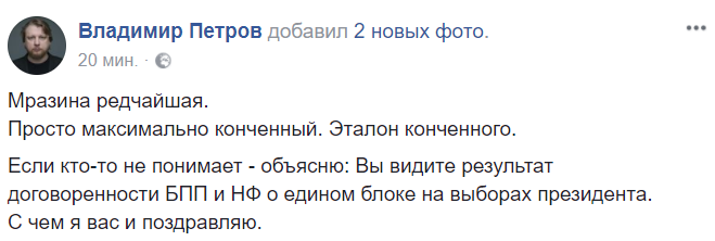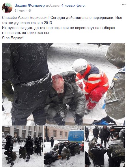 "Почему я двумя руками поддерживаю силовой разгон "михомайдана" в Киеве? Потому что собравшихся там действительно надо пи...дить. Их, и таких как они, и таких как я - очень сильно пи...дить. Чтобы, наконец, поняли - за кого мы проголосовали в 2014 году. И что люди, которые позволяют себе проливать кровь своего же народа - не имеют права называться людьми. Не то, что иметь какие-либо полномочия. Видимо, мало нас ещё били по голове, раз многие до сих пор этого не поняли", - сказал он.