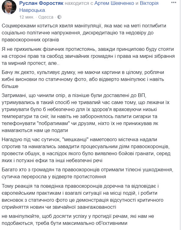 "Задержанные, которые сопротивлялись, а позже были доставлены в отделение, содержались таким образом (на корточках или на коленях. – Прим. Ред.) именно потому, что лежа их удерживать было бы опасно для их здоровья, учитывая низкие температуры и снег, им даже не запрещалось курить и звонить побратимам или друзьям, никто не унижал, как пытаются нам это подать", – написал правоохранитель у себя в Facebook.