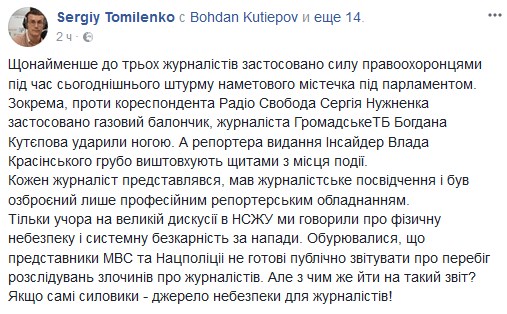 "В частности, против корреспондента "Радио Свобода" Сергея Нужненко применен газовый баллончик, журналиста "ГромадськеТБ" Богдана Кутепова ударили ногой. А репортера издания "Инсайдер" Красинского грубо выталкивают щитами с места происшествия", - пишет он.