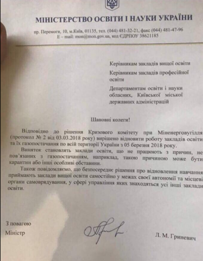 "Кризисный комитет при Минэнергоугля решил снять ограничения по газоснабжению всех учебных заведений и предложил Минобразования восстановить их работу с 5 марта 2018", – написал он.