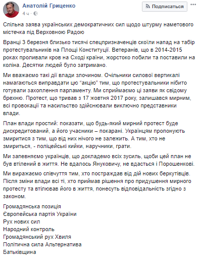 "Утром 3 марта около тысячи спецназовцев совершили нападение на лагерь протестующих на площади Конституции. Ветеранов, которые в 2014-2015 годах проливали кровь на Востоке страны, жестоко избили и поставили на колени. Десятки человек были задержаны.